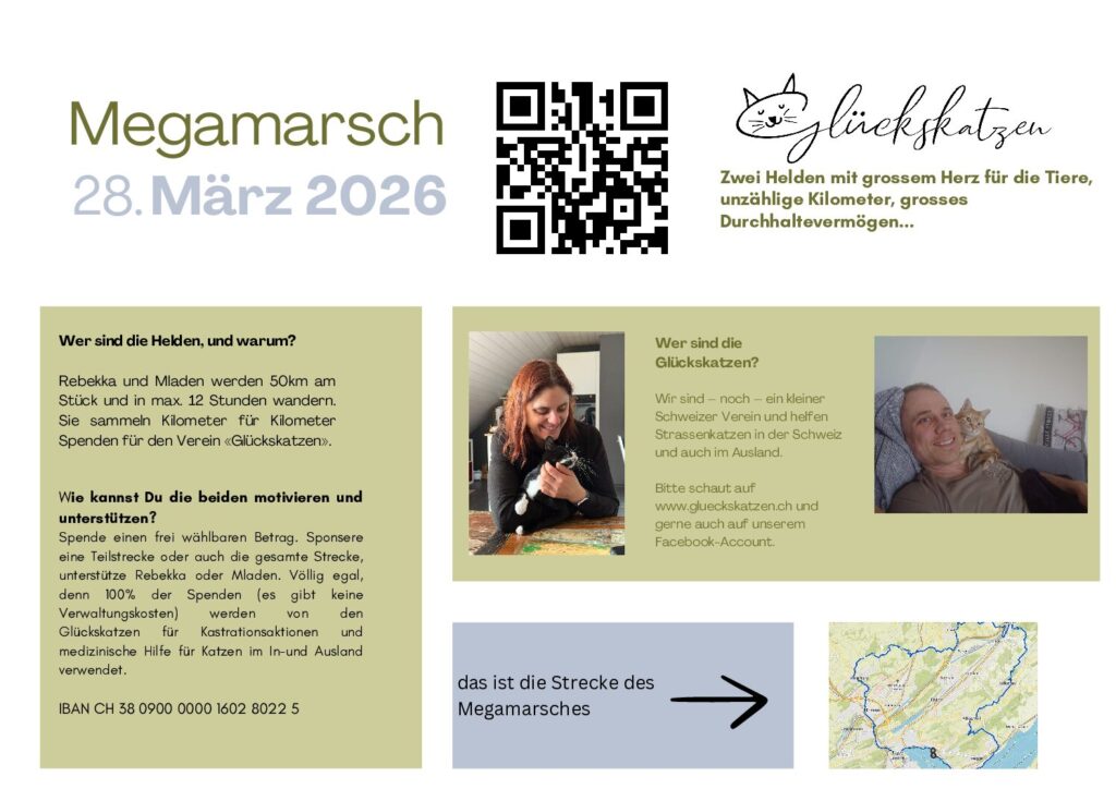 Es passiert etwas… Zwei unserer Mitglieder, Rebekka Richter und Mladen Milić haben etwas ganz Tolles vor: Sie werden im März beim Megamarsch in Luzern teilnehmen und damit Spenden sammeln. Die beiden sind bereits fest im Training. Die Glückskatzen sind total begeistert und dankbar, und wir hoffen, Ihr alle unterstützt sie indem Ihr auch einen kleinen Beitrag spendet und auch die Aktion fleissig teilt! Es wäre nicht nur für uns Glückskatzen super, wenn die Aktion ein richtiger Erfolg wird, sondern auch für unsere beiden Helden.